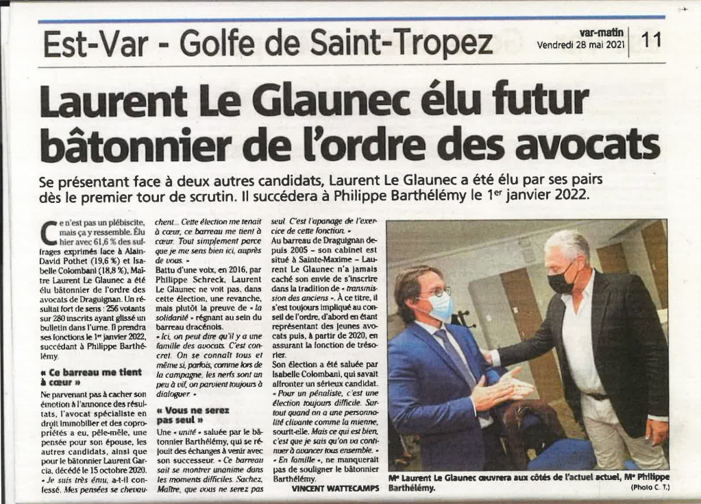 Publié le : 31/05/2016 31 mai mai 05 2016actus presseLes avocats inscrits au barreau de Draguignan viennent d'élire leur nouveau b...